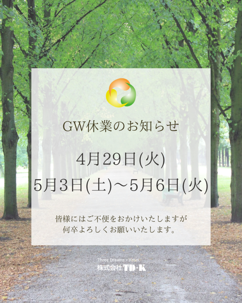 GWのお知らせ 新着情報 2025.04.252026.04.23 2025年度 当社のGW休暇は 4月29日(火)5月3日(土)〜5月6日(火)となっております。 皆様にはご不便をおかけいたしますが何卒よろしくお願いいたします。